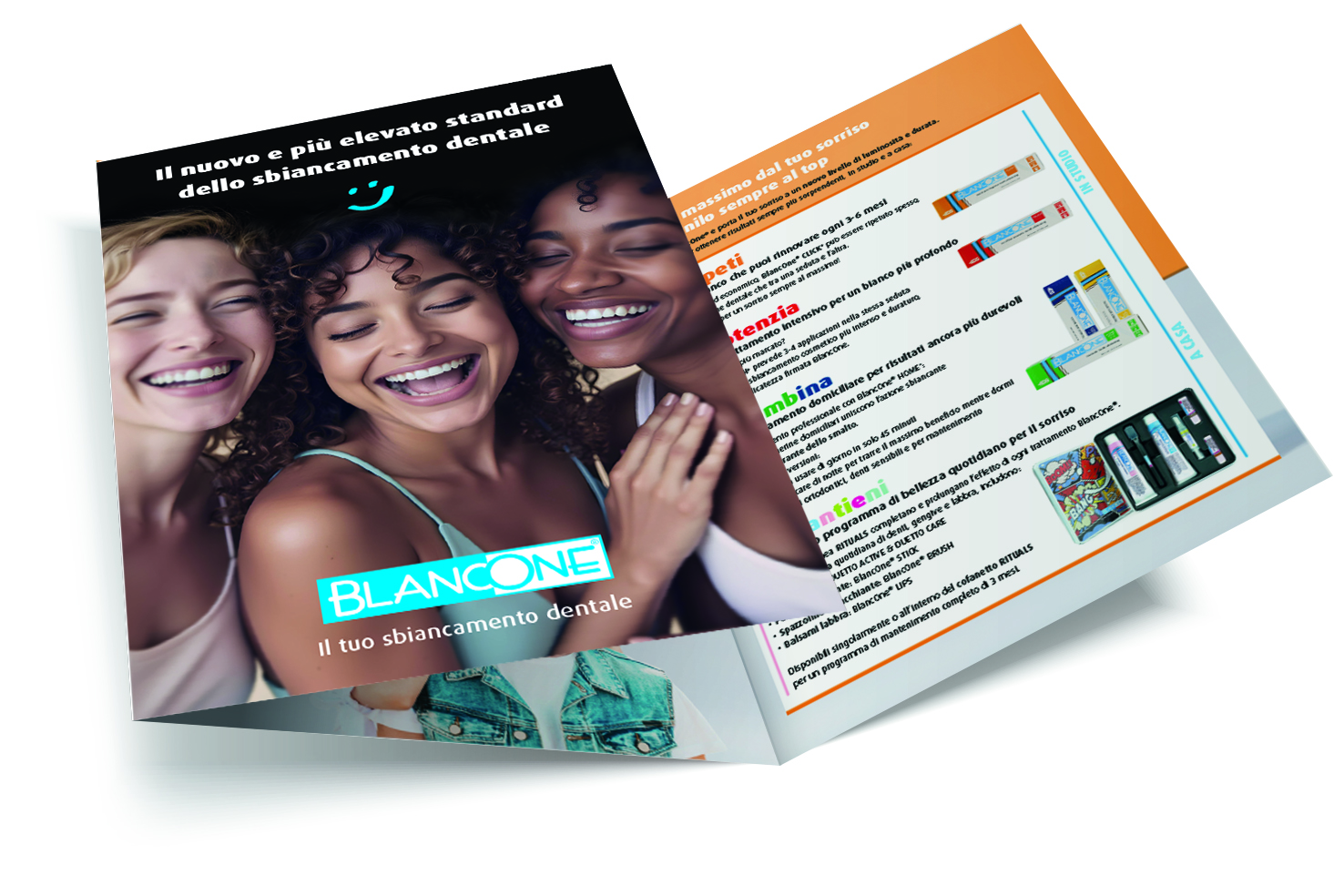 Coinvolgi e informa i tuoi pazienti con i depliant BlancOne®, progettati per la sala d’attesa. Un formato elegante e sintetico che presenta il sistema BlancOne® e i suoi trattamenti: